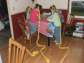 We had "berry pie" which actually was meatloaf and mashed potatoes and then sherbet and sprite for a drink. They were bouncing out of their seats for a piece of pie and when I gave Abby a piece she stopped and looked at it and said "this doesn't smell like pie, hey this smells like beef!!" Totally funny! So after "dessert" for dinner we had "breakfast" for dessert!